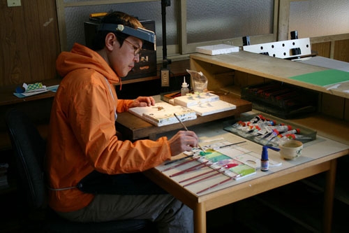 日本のアーティスト・樋口明宏が昆虫に油絵の具を塗っている