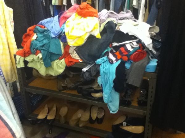 服屋でたたんで戻そうとすると、店員に「こちらで直すので、そのままでいいですよ」って言われない?そう言われるパターンが多いな。多分、店員が直した方が綺麗にたためるからだと思うけど。