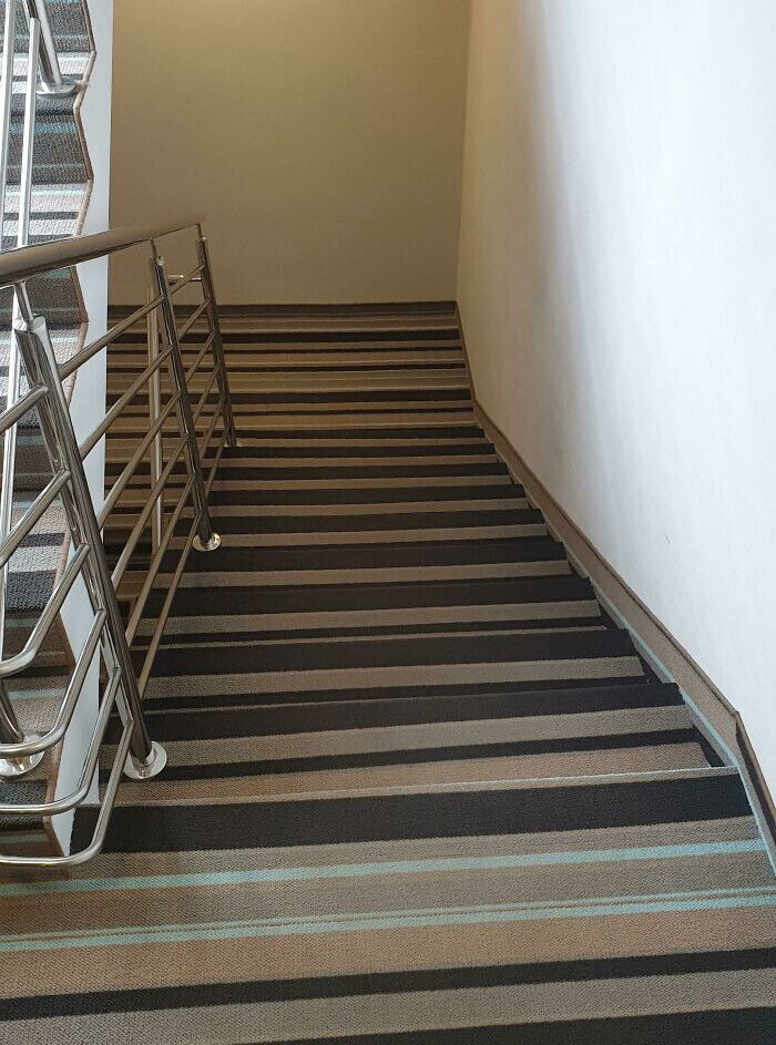 ホテルの階段にストライプ模様のカーペットが敷かれてた