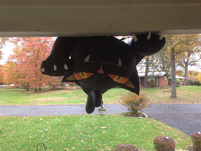 ハロウィンで屋根に取り付けたはずに空気で膨らませる猫