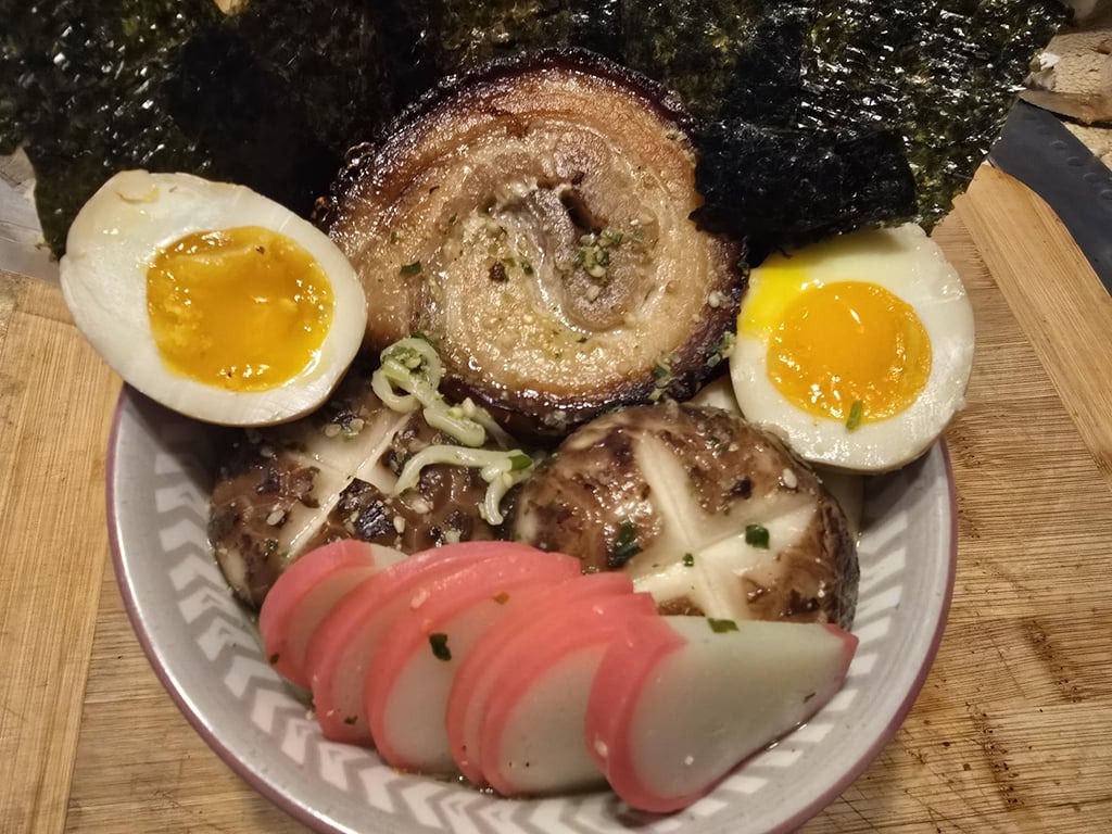 チャーシュー、卵、海苔、かまぼこ、キノコは美味しそうだけどな