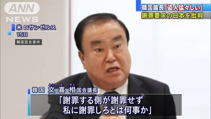 韓国の文喜相国会議長は18日付の韓国紙・朝鮮日報に掲載されたインタビューで、慰安婦問題で天皇陛下の謝罪が望ましいと述べたことについて「謝罪する考えはなく、そのようなことでもない」と断言した。また、「戦争や人倫(人道)に関連した犯罪には時効がない」と主張した。聯合ニュースとの会見では「謝罪すべき側(日本)がせずに、私に謝れとは何だ。盗っ人たけだけしい」と非難。慰安婦問題などをめぐる日韓摩擦の背景には、国内政治を意識した「安倍晋三首相の政略的な思考がある」と強調した。日本政府は謝罪と発言撤回を求めているが、文氏自身が拒否の意向を改めて明確にして反発したことで、早期の幕引きは極めて難しくなった。(時事ドットコム)