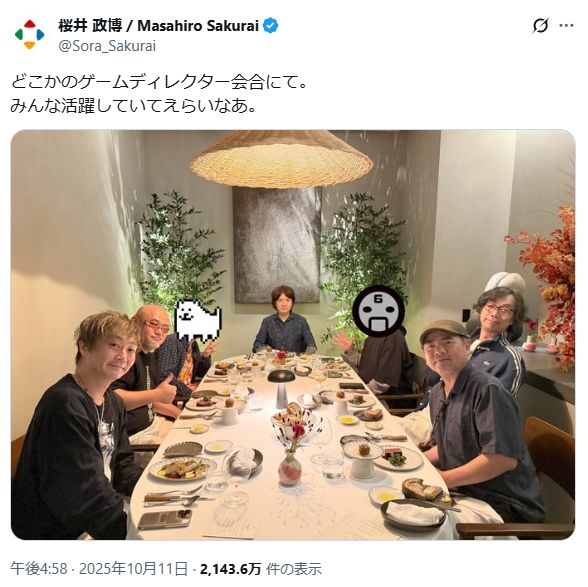 桜井政博氏のゲームレジェンド食事会、構図やメンバーに海外ファン盛り上がる