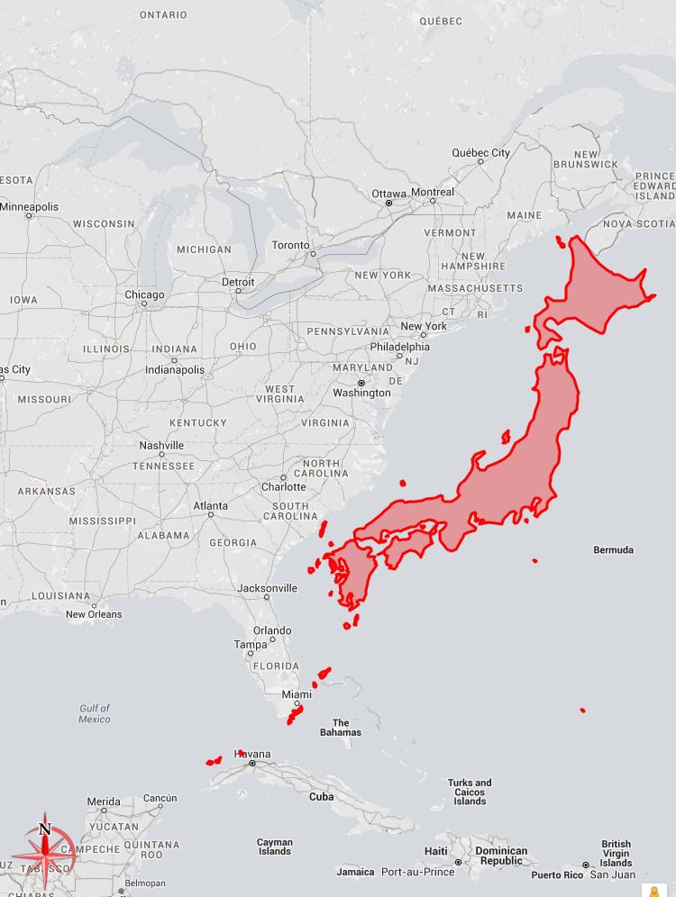 日本は現実的にどれくらいの大きさなのか地図にしてみた(アメリカの東海岸と比較)