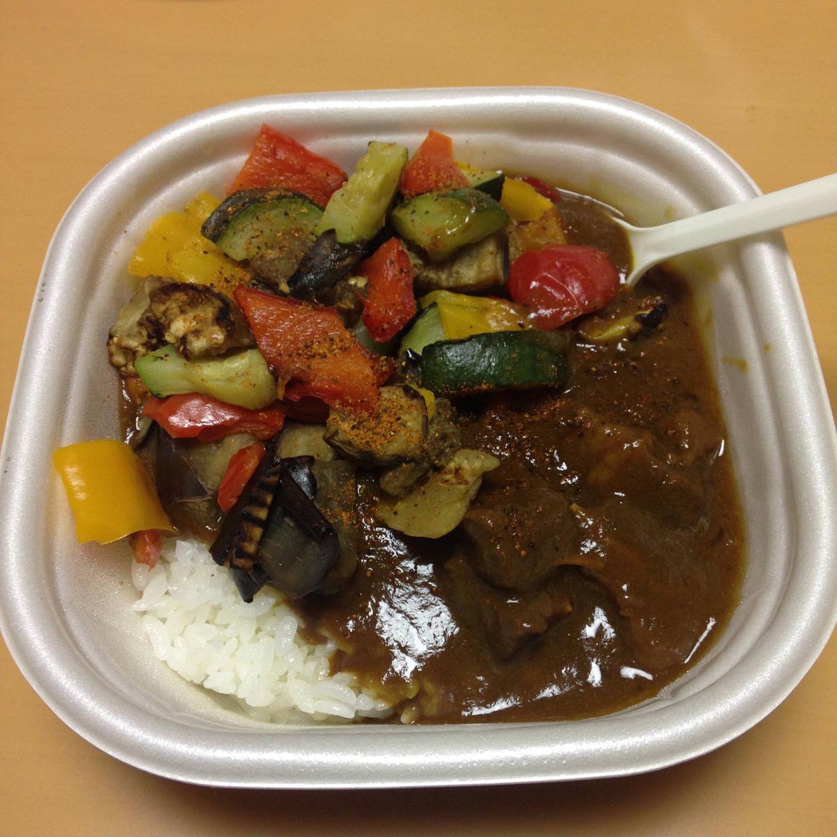 セブンイレブンのカレーに、セブンイレブンのちょっと高級な冷凍カット野菜(200円)を乗せて、グリル野菜のビーフカレーの完成!