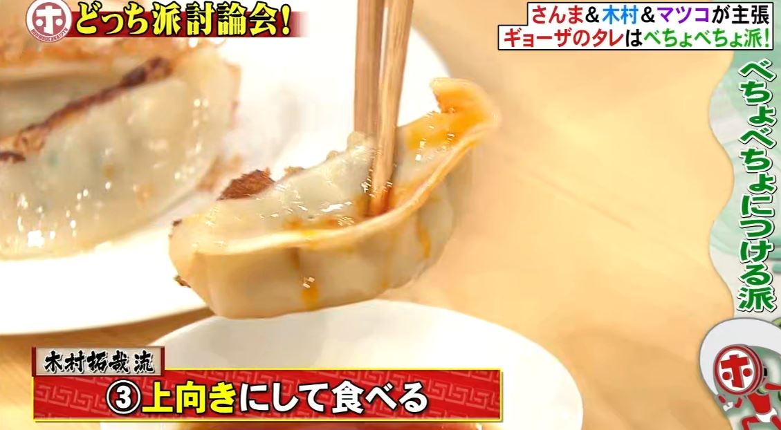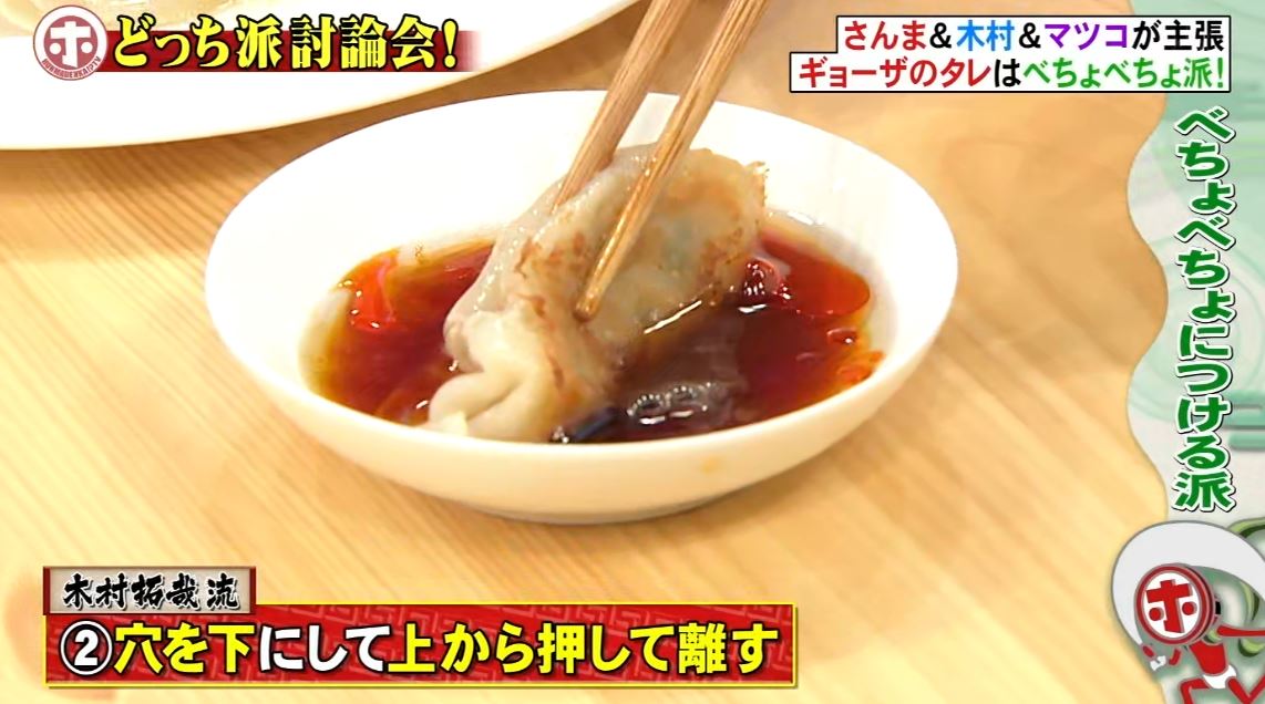 2 タレに漬けて穴を下に箸で餃子を押して空気を出す。