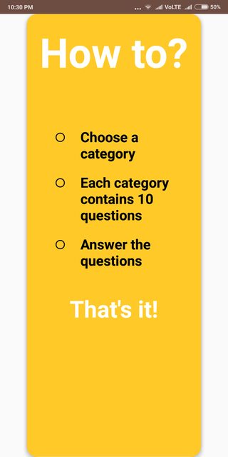 Quiz App This is the Quiz App made as a part of Udacity-Google Android Basics Nanodegree Project. Some of the app screenshots: Alt text Alt text Alt text Alt text Alt text Alt text
