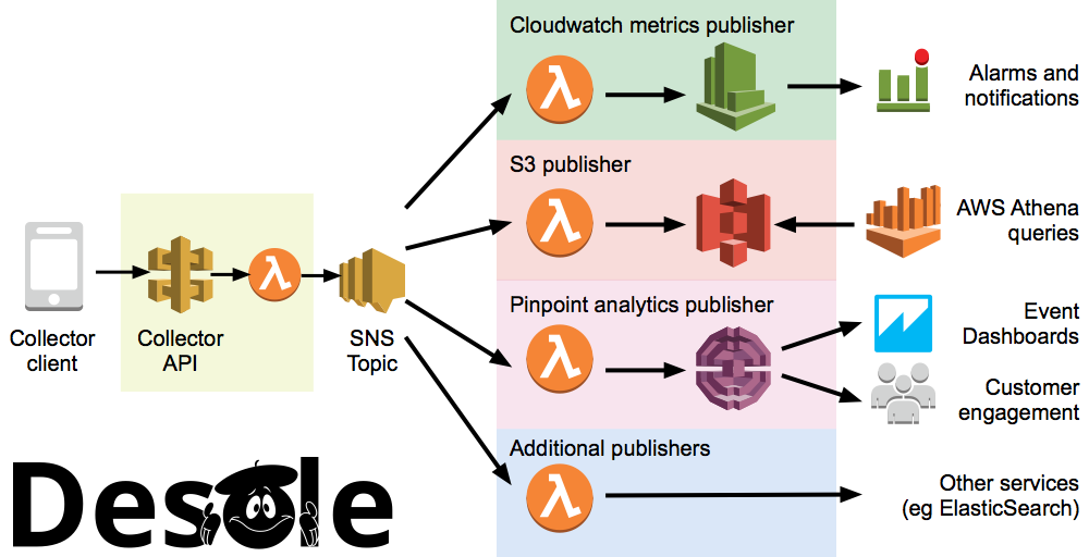 This repository contains the back-end components for Desole: the event collector API and the standard publishers, including a Cloudformation template you can use to deploy the Desole back-end into your AWS account. Check out https://desole.io for more information on how to set up the client collectors.