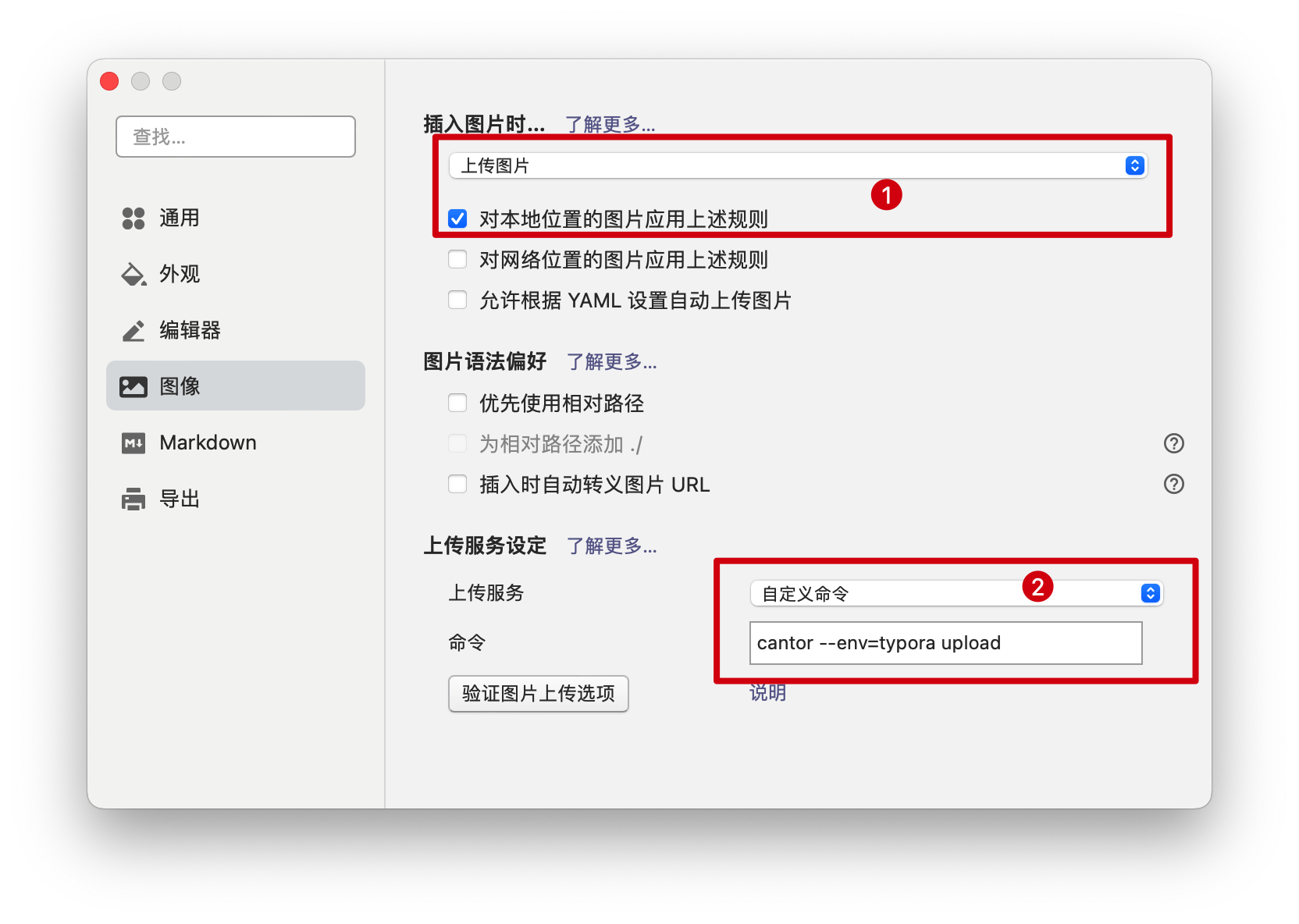 # 需要安装应用并完成 GitHub 图床相关配置才可在终端使用 # 安装 cantor 终端程序 go install github.com/evercyan/cantor/cmd/cantor@latest # 上传文件 cantor upload ~/demo.png ~/demo1.png # 安装终端程序后, 可在 typora 里如下图所示配置图片上传, 其他应用亦是同理