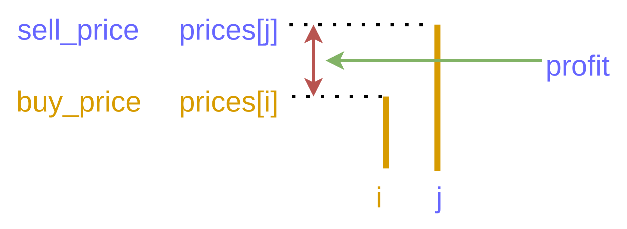 - 當 prices[sell] > prices[buy] 時,更新 maxProfit = max(maxProfit, prices[sell] - prices[buy])
