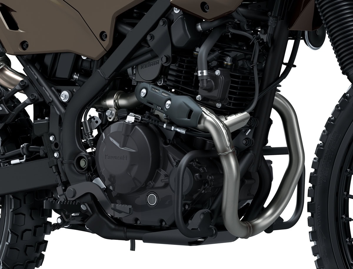 [画像:「KLX230 SHERPA S」はシート高が825mmなので足つき性がよい高いマルチパーパスモデル]232cc空冷4ストローク単気筒SOHC2バルブエンジンを搭載した「KLX230 SHERPA S」は、オフロードモデルのスタイルながらシート高が825mmと足つき性がよく、より多くのライダーにフィットする仕様となっている1台。低中回転域でのトルクを重視したエンジン特性はオフロードで活躍し、足つきがいいこともオフロードで安心感を与えてくれます。