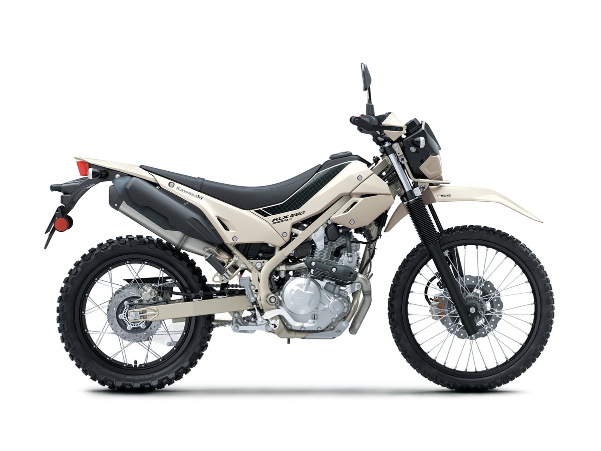 [画像:「KLX230 SHERPA S」ホワイティッシュベージュ]さらに剛性としなやかさを兼ね備えたペリメター構造セミダブルクレードルフレームを採用。必要に応じてOFFにすることができるデュアルパーパスABSを標準装備するなど、制動機能も充実しています。
