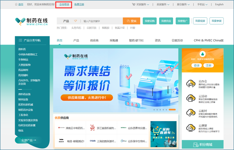访问中文站:www.cphi.cn 点击首页顶部"会员登录"按钮登录,通过以下三种方式登录用户中心。