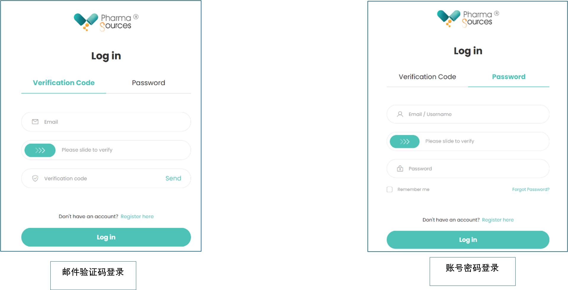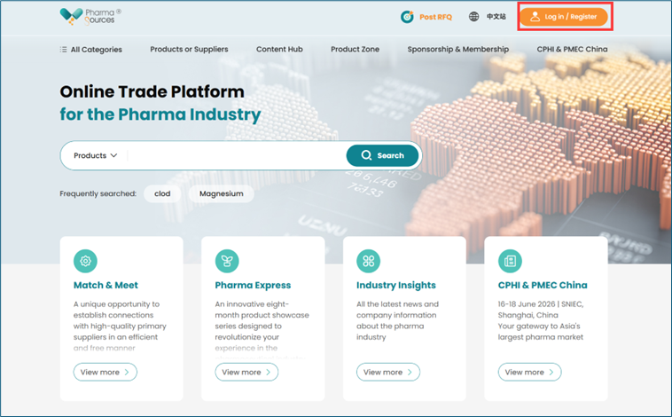 或访问国际站:www.pharmasources.com 点击首页顶部"Log in"按钮登录,通过以下两种方式登录用户中心。