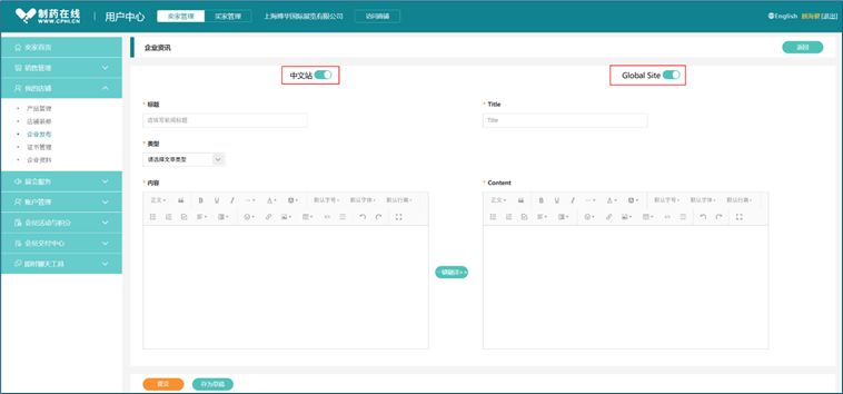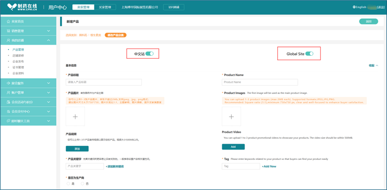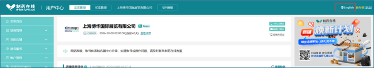 登录中文站或国际站任一账号,均可对中文站或国际站商铺进行管理,实现"一账通",点击管理后台顶部"中文"或"English"实现中文/英文语言版本随意切换。