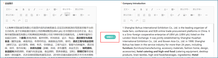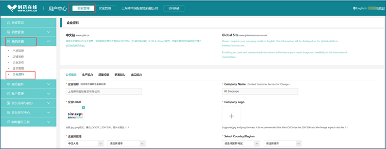 点击"卖家管理--我的店铺--企业资料",填写中文站及国际站企业基本信息:公司信息、生产能力、质量控制、研发能力和出口能力,完善后点击【提交】按钮。"一键翻译"按钮轻松祝您实现中英双语快速互翻。