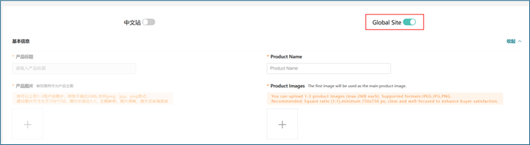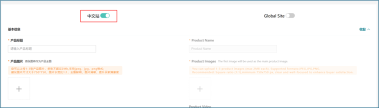 选择产品上传的站点的开关,打开后可上传产品:1)同时上传中文站和国际站;2)只上传中文站;3)只上传国际站。