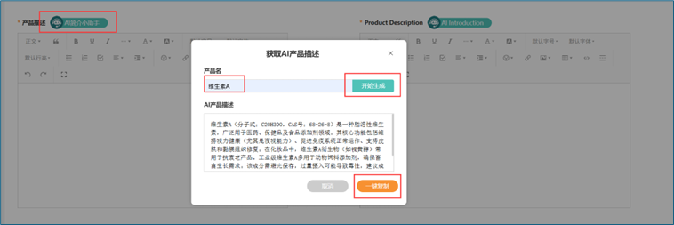 点击"AI简介小助手",快速生成产品简介。操作步骤:输入产品名,点击"开始生成",点击"一键复制"到产品描述中。