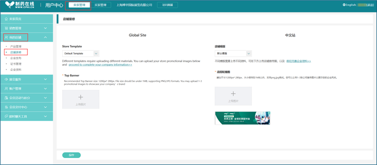 点击"卖家管理--我的店铺--店铺装修",上传贵司宣传图片,点击【保存】按钮,图片即可展示在贵司商铺首页。
