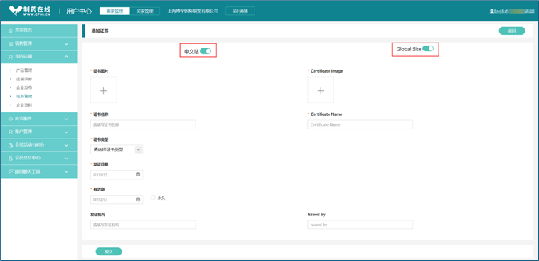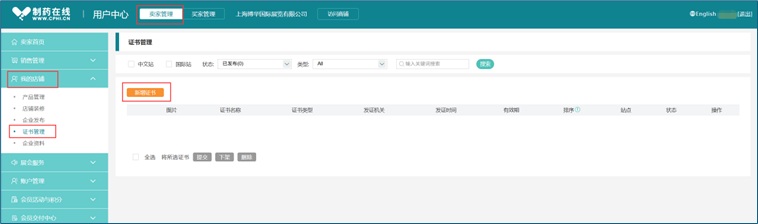点击"卖家管理--我的店铺--证书管理",点击"新增证书"即可上传贵司中文站和国际站的企业证书、产品证书、危险化学品证书和其他证书。