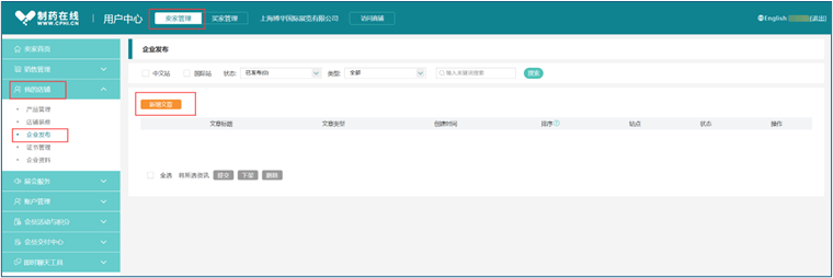 点击"卖家管理--我的店铺--企业发布",点击"新增文章"即可上传贵司中文站和国际站的企业新闻、企业活动和技术文章等。