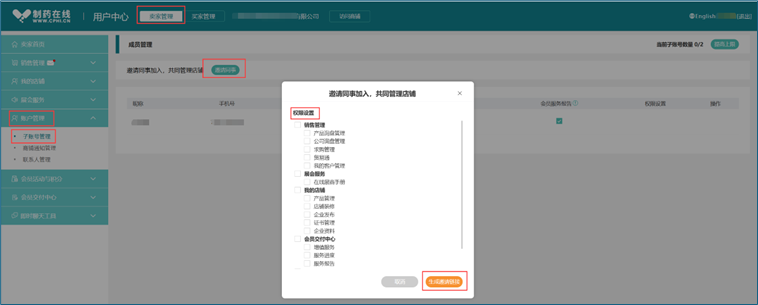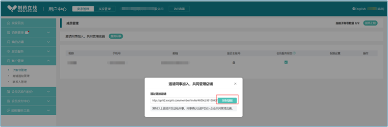 第一步:点击"卖家管理—账户管理--子账号管理--邀请同事--设置管理权限--生成邀请链接--复制链接" 将链接发送给子账号管理同事。
