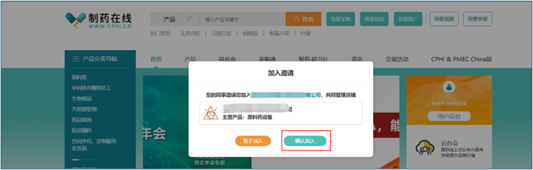 第二步:请同事点击"确认加入",登录或注册制药在线买家账号。