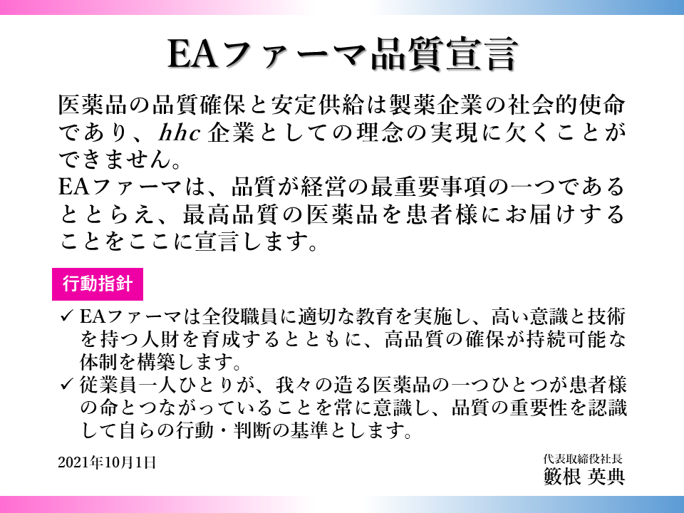 私たちは「EAファーマ品質宣言」において、従業員一人ひとりが、私達の造る医薬品の一つひとつが患者様の命とつながっていることを常に意識し、品質の重要性を認識して自らの行動・判断の基準とすることを謡っております。hhc 理念のもと、患者様そして社会からの期待に応え、確かな品質をもって着実に安定的に医薬品をお届けすることを使命として、全員が一丸となって日々生産業務に取り組んでおります。これからも様々な環境変化に柔軟に対応し、持続可能な生産体制を築いていきます。