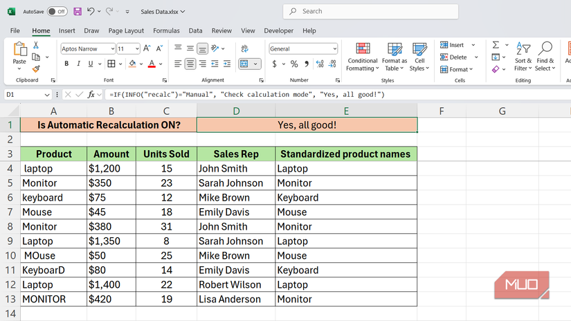 =IF(INFO("recalc")="Manual", "Check calculation mode", "Yes, all good!")