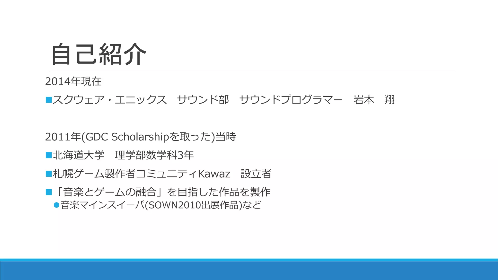 自己紹介 2014年現在 スクウェア・エニックスサウンド部サウンドプログラマー岩本翔 2011年(GDC Scholarshipを取った)当時 北海道大学理学部数学科3年 札幌ゲーム製作者コミュニティKawaz 設立者 「音楽とゲームの融合」を目指した作品を製作 音楽マインスイーパ(SOWN2010出展作品)など