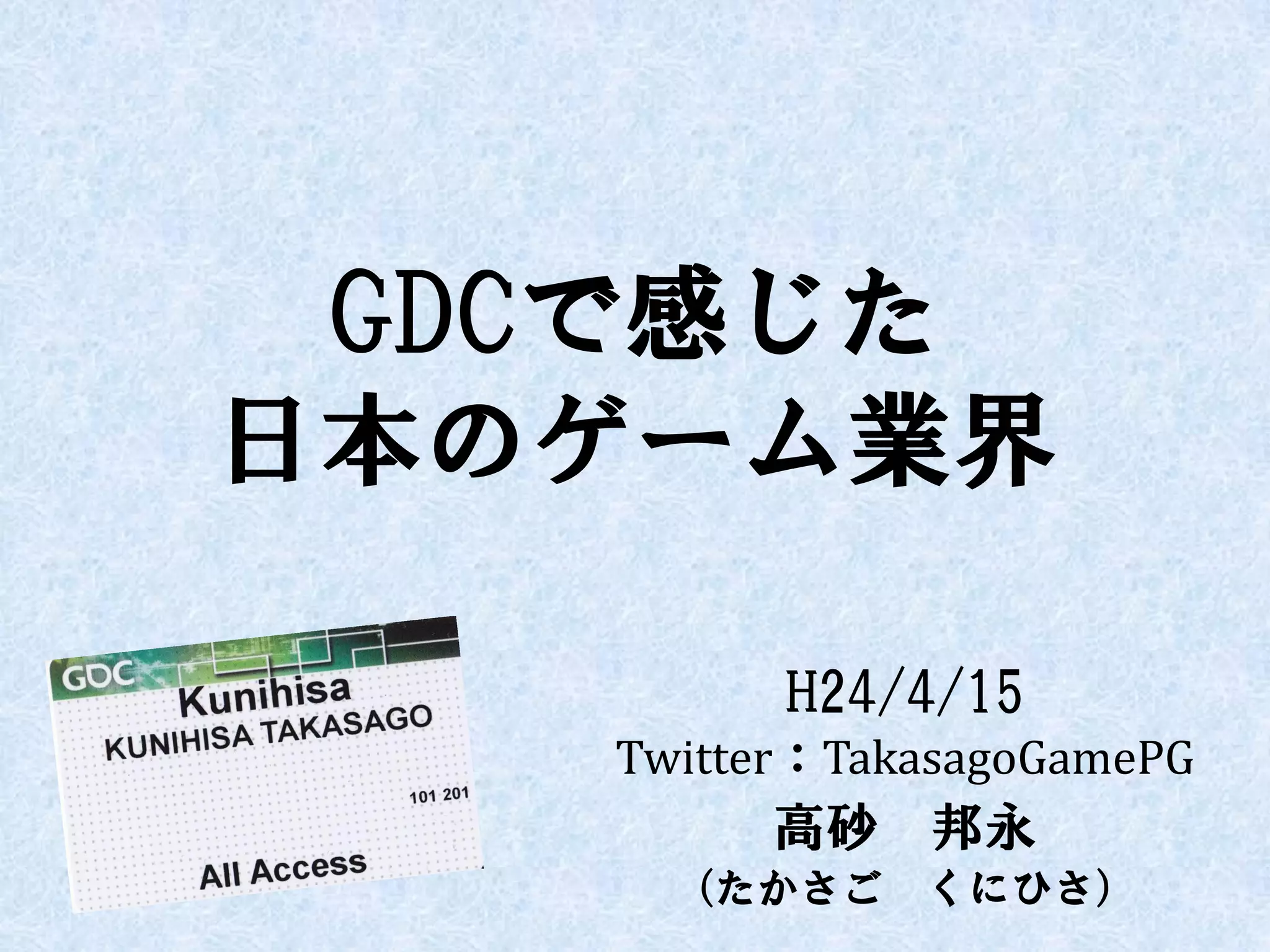 GDCで感じた 日本のゲーム業界 平成24年4月15日 Twitter:TakasagoGamePG 高砂 邦永 (たかさご くにひさ)