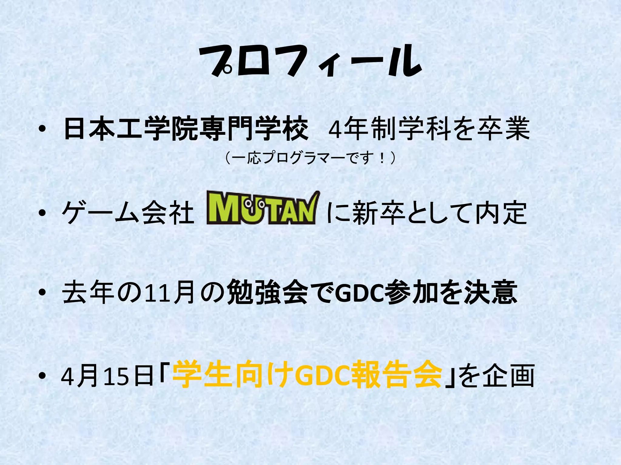プロフィール • 日本工学院専門学校 4年制学科を卒業 (一応プログラマーです!) • ゲーム会社 に新卒として内定 • 去年の11月の勉強会でGDC参加を決意 • 4月15日「学生向けGDC報告会」を企画