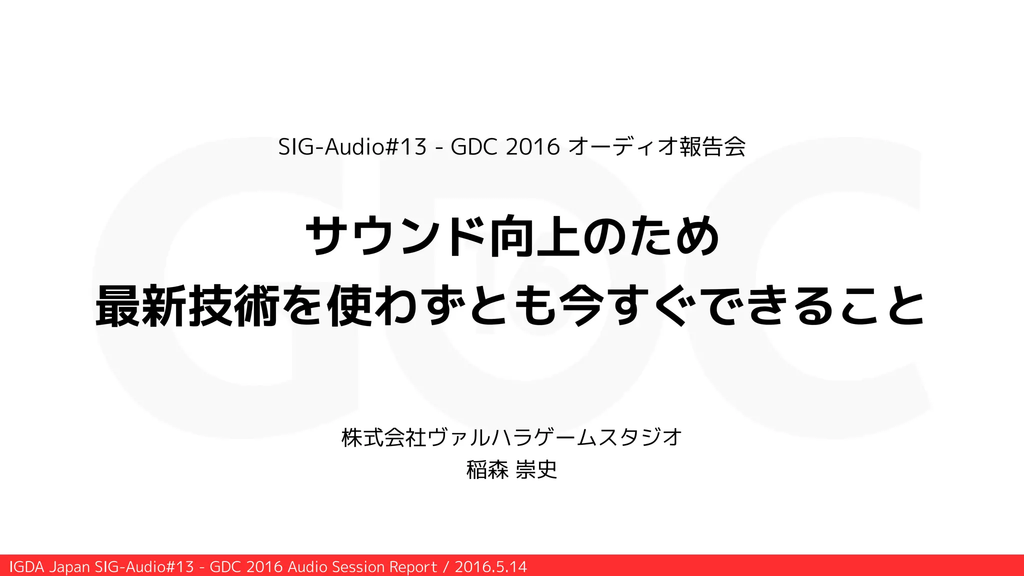 IGDA Japan SIG-Audio#13 - GDC 2016 Audio Session Report / 2016年5月14日 SIG-Audio#13 - GDC 2016 オーディオ報告会 ! サウンド向上のため 最新技術を使わずとも今すぐできること 株式会社ヴァルハラゲームスタジオ 稲森 崇史