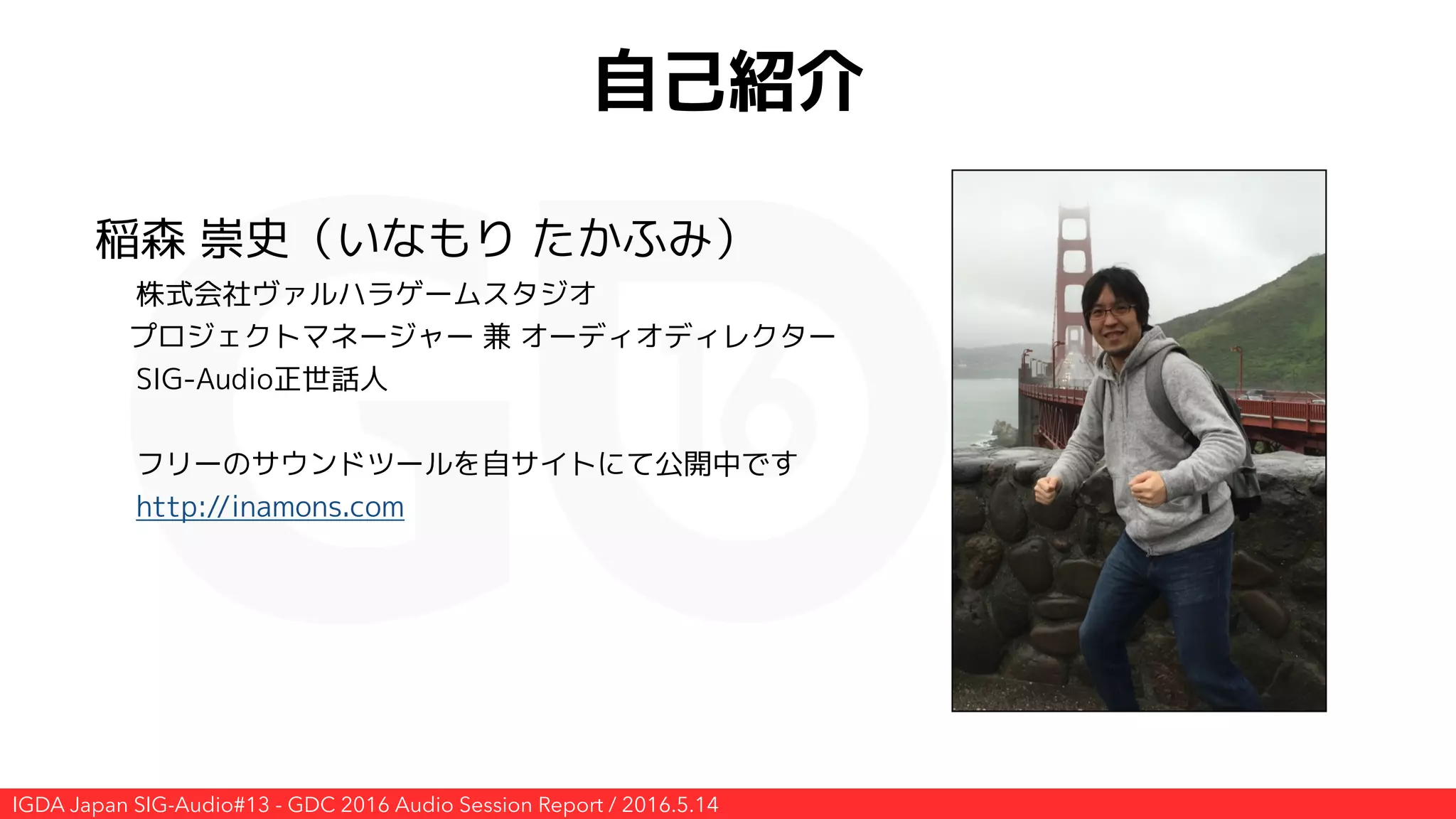 IGDA Japan SIG-Audio#13 - GDC 2016 Audio Session Report / 2016年5月14日 自己紹介 ! 稲森 崇史(いなもり たかふみ) 株式会社ヴァルハラゲームスタジオ プロジェクトマネージャー 兼 オーディオディレクター SIG-Audio正世話人 ! フリーのサウンドツールを自サイトにて公開中です http://inamons.com