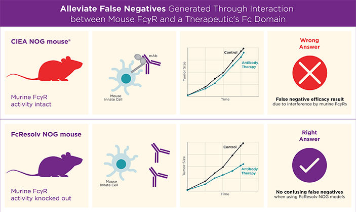 Researchers who work with antibody-based therapies find that murine Fc gamma receptors (FcγRs) can confound preclinical study results, causing false positives or false negatives that lead to incorrect conclusions and derail drug discovery. FcResolv® NOG models lack FcR expression to provide clarity in antibody-based drug studies, offering greater confidence and more translatable data while utilizing fewer resources.