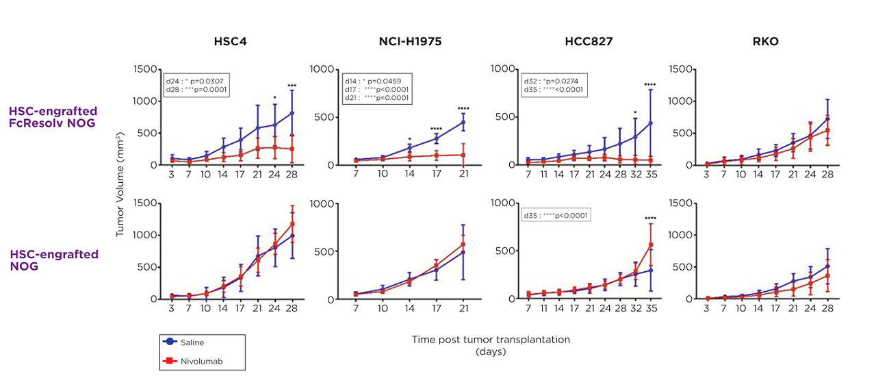 Functional knockout of murine FcγR activity enables accurate detection of immunotherapy efficacy in humanized mice engrafted with tumors. Nivolumab (anti-PD1) does not suppress tumor growth in HSC-engrafted NOG mice (bottom row) but displays anti-tumor efficacy in HSC-engrafted FcResolv NOG mice (top row) where there are no murine FcγRs to interact with the Fc domain of the therapeutic. From Katano et al. 2021.