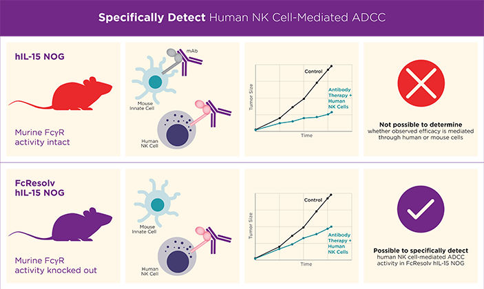 The hIL-15 NOG mouse supports human NK cell engraftment through expression of the human IL-15 cytokine and can be used to study therapeutics which act through ADCC mediated by human NK cells. However, FcγRs expressed on residual murine immune cells in the hIL-15 NOG mouse can interact with the Fc domain of an antibody-based therapeutic and trigger off-target effects (for example, tumor growth inhibition) mediated through mouse innate immune cells which are independent of the therapeutic's intended mode of action. In FcResolv hIL-15 NOG mice these FcγRs are absent, so human NK cell-mediated ADCC can be specifically detected without having to deconvolute the contribution of off-target effects to observed efficacy.