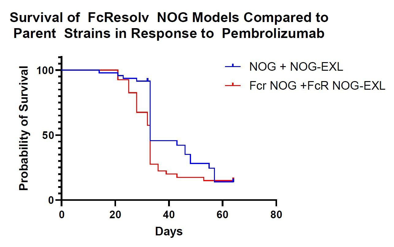 Survival curve of FcResolv huNOG & FcResolv huNOG-EXL compared to their base models huNOG & huNOG-EXL, which have intact murine Fc gamma receptors (FcgRs). Survival curves generated by combining data from two independent studies (n=47 huNOG + huNOG-EXL, n=40 FcResolv huNOG & FcResolv huNOG-EXL) illustrate a potential trend (weak significance of 0.03), likely due to the absence of murine FcgRs and subsequent Pembro binding, leading to slightly decreased survival. Results will vary based on dosing, tumors, etc.